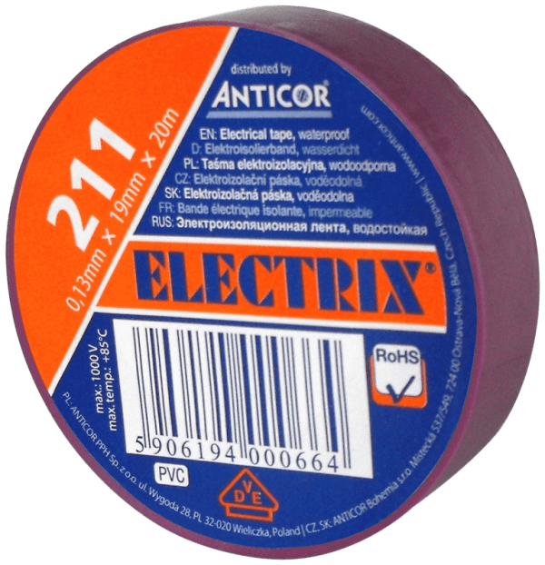 Taśma izolacyjna 211P w kolorze fioletowym o szerokości 19 mm i długości 20 m, idealna do różnych zastosowań w elektrotechnice i budownictwie.