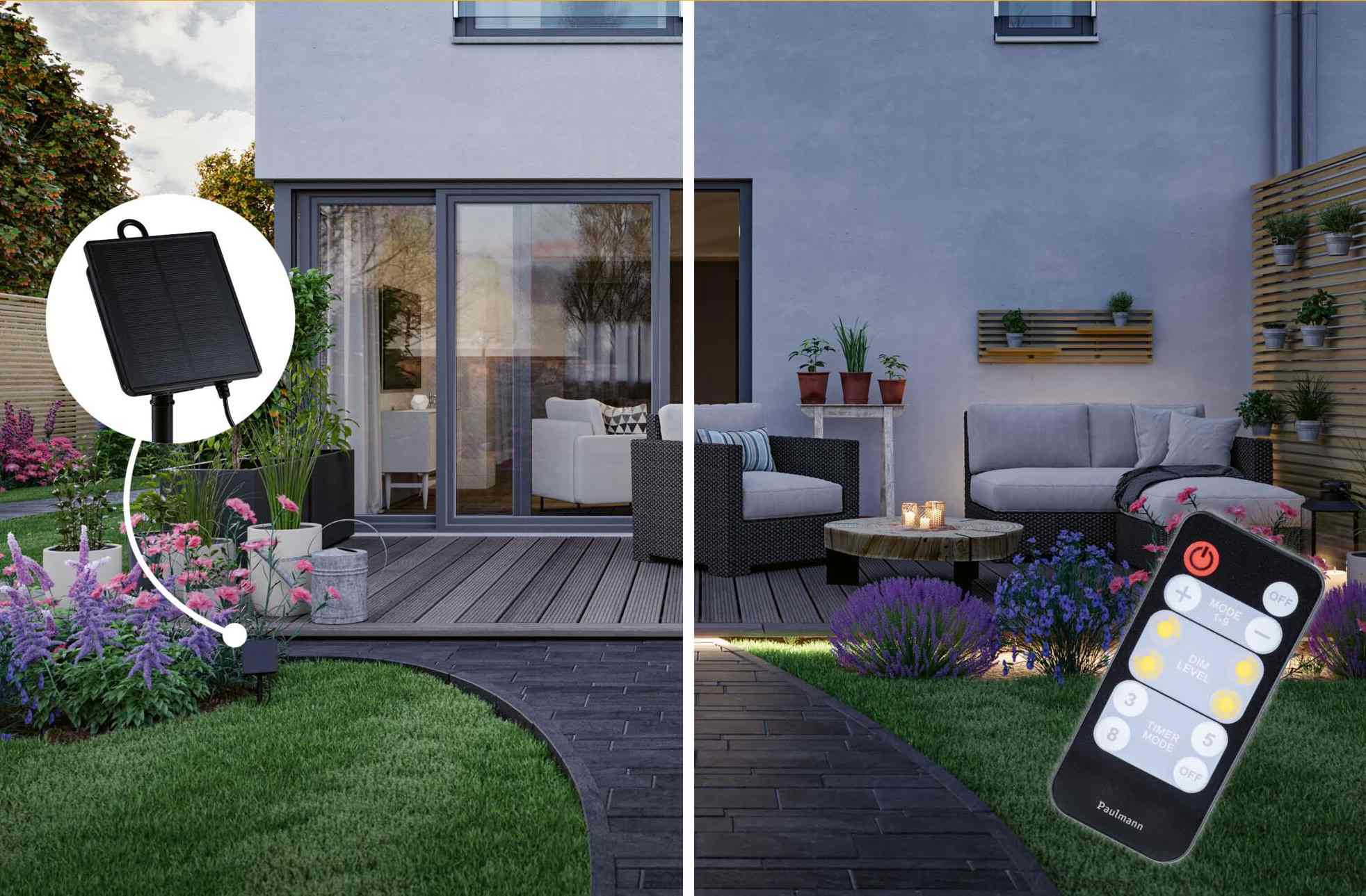 The 5m solar LED strip light is an innovative and energy-efficient lighting solution that is perfect for patios or gardens. The strip provides exceptional lighting effects, and its minimalist design blends seamlessly into any environment. The solar power supply allows for installation without access to mains power. Thanks to the twilight sensor, the light turns on automatically when it gets dark; the included remote control allows for operation, dimming, or setting a timer according to your needs. A quick battery charging time and long lighting duration ensure reliable use. The standard lithium-ion battery is replaceable and can be easily swapped out if needed.