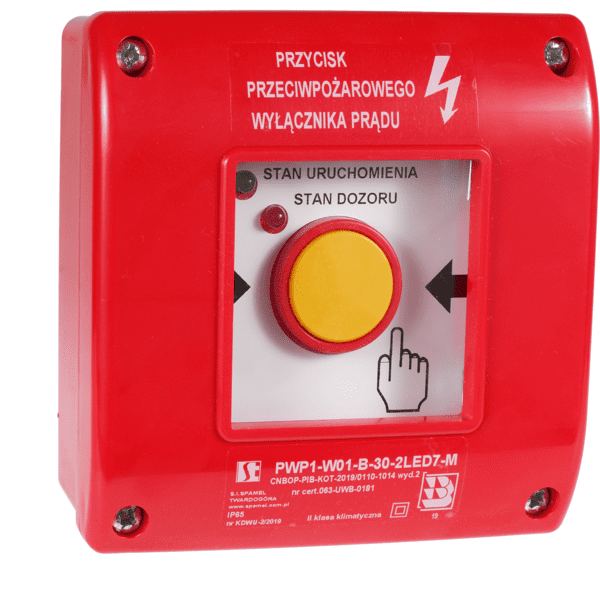 The fire power cut-off switch, which disconnects the power supply to all circuits except those powering installations and devices essential during a fire, should be used in fire zones with a volume exceeding 1000 m³ or containing explosion hazard zones. The manual activation button PWP1 can be used as a “Fire Power Cut-off Switch,” provided that a sign reading: “Fire Power Cut-off Switch” is placed above it. A self-adhesive sign: “Fire Power Cut-off Switch” is included. The manual activation button PWP1 with dual LED signaling provides information about the activation status and supervision status.