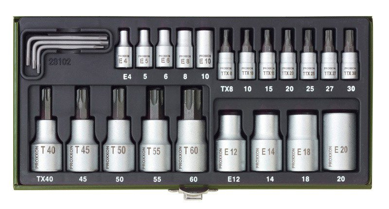 The professional PROXXON TX wrench set is an essential tool for every mechanic. The set includes 24 precisely crafted tools that can handle even the toughest challenges.