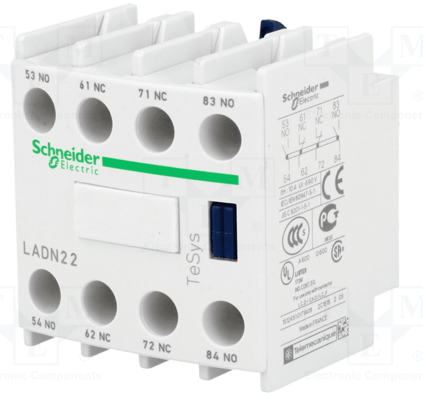 LADN22 is an additional auxiliary contact block from Schneider Electric for TeSys D and TeSys F contactors, ideal for safety applications.