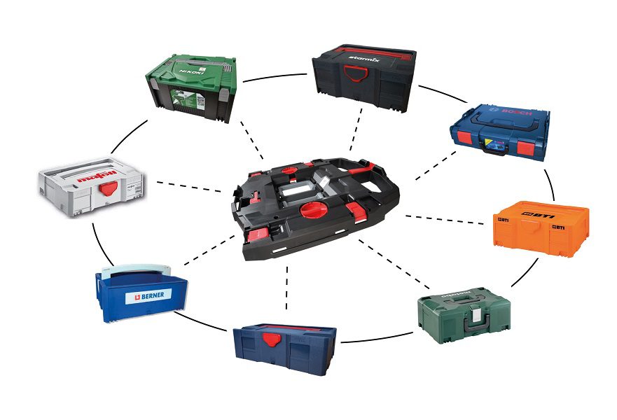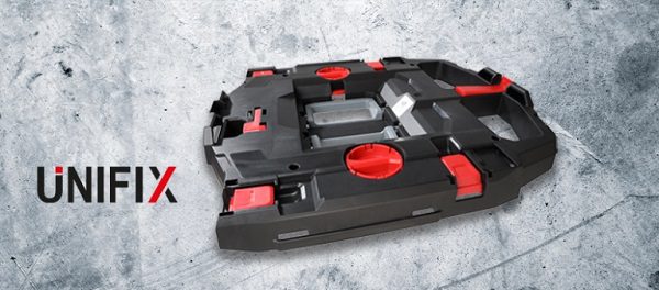 The installation of the Unifix plate is simple – just place it on the vacuum cleaner and turn the red knobs. It applies to systainers of the Tanos, L-Boxx, and Sortimo types, which are tool boxes from brands such as Bosch, Metabo, Hitachi, Hikoki, Festool, Makita, Panasonic, Flex.