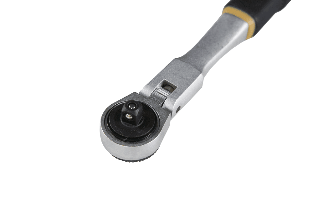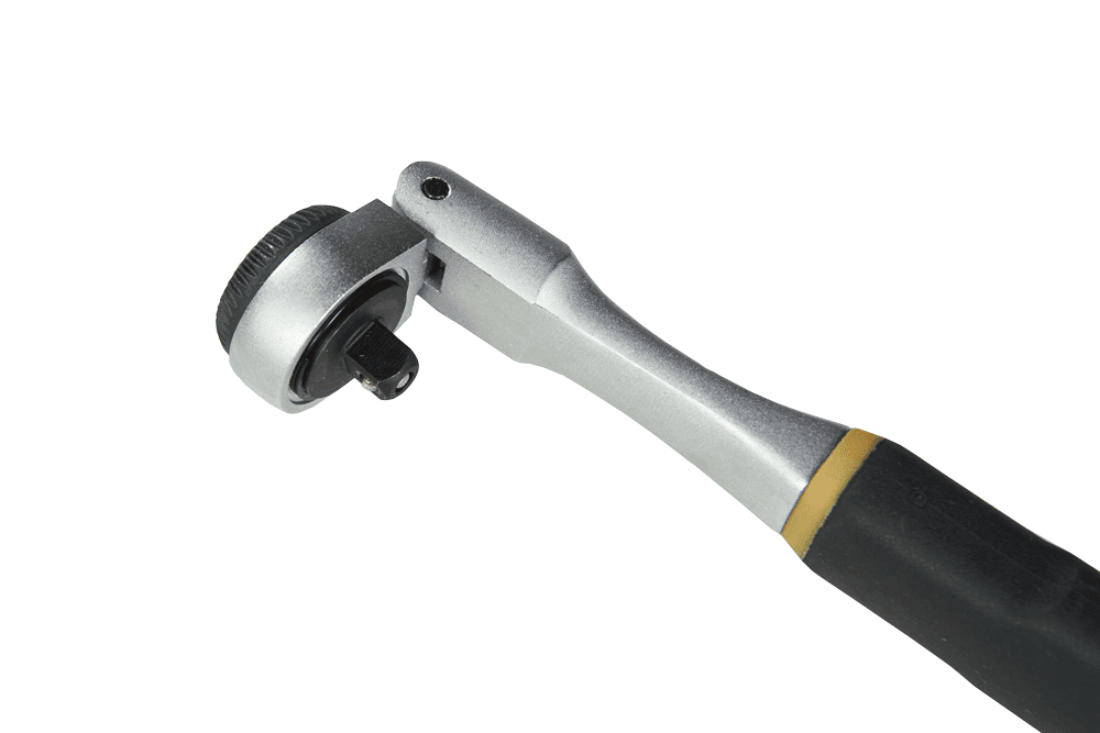 Grzechotka 1/4″ z ruchomą główką! Do mechaniki precyzyjnej, wykonana ze stali chromowo-wanadowej 31 CrV 3. Główka może być ustawiana w 6 pozycjach do 90 stopni. Użyteczna wszędzie tam, gdzie przestrzeń jest ograniczona. Z przełącznikiem bezpośrednio w głowicy. Precyzyjne zazębianie, niezwykle trwała. Kilka zębów zazębia się jednocześnie przenosząc duże momenty. Zdejmowanie nasadek przy pomocy przycisku. Głowica i rączka wykonane z jednorodnego stopu. Uchwyt wykonany z odpornego na olej i kwas TPR (Thermoplastic Rubber). Z otworem umożliwiającym zawieszanie.