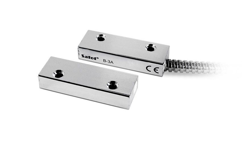 Czujki magnetyczne są podstawowym elementem ochrony obwodowej. Średniej wielkości, hermetyczna czujka kontaktronowa B-3A w metalowej obudowie, przeznaczona jest do montażu powierzchniowego. Przewody w metalowej osłonie utrudniają ich uszkodzenie, dzięki czemu czujka ta doskonale sprawdzi się w miejscach szczególnie narażonych na sabotaż lub mechaniczne narażenia. Przeznaczona jest tylko do przykręcania do podłoża.