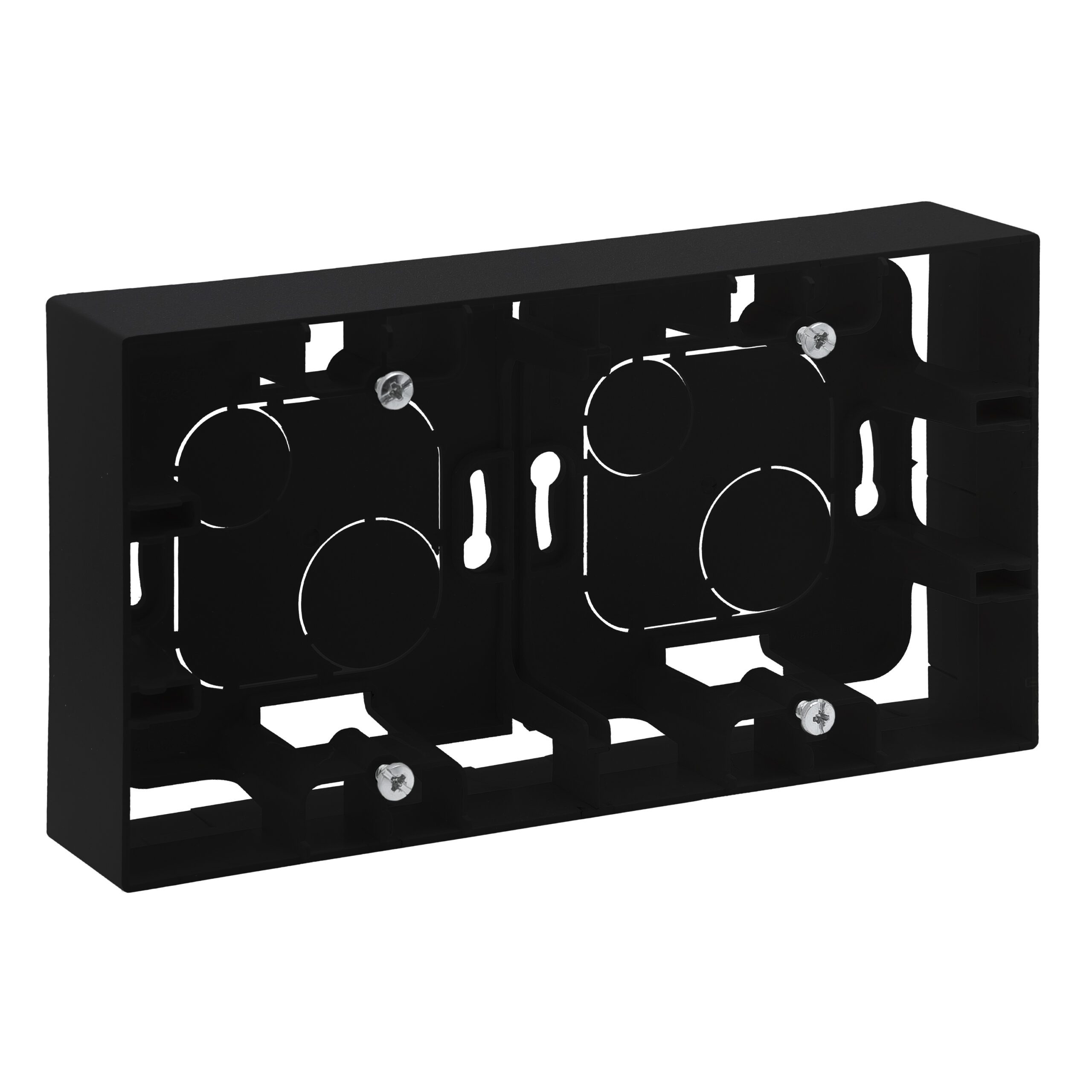 Puszka natynkowa podwójna o eleganckim czarnym wykończeniu, idealna do montażu poziomego lub pionowego.