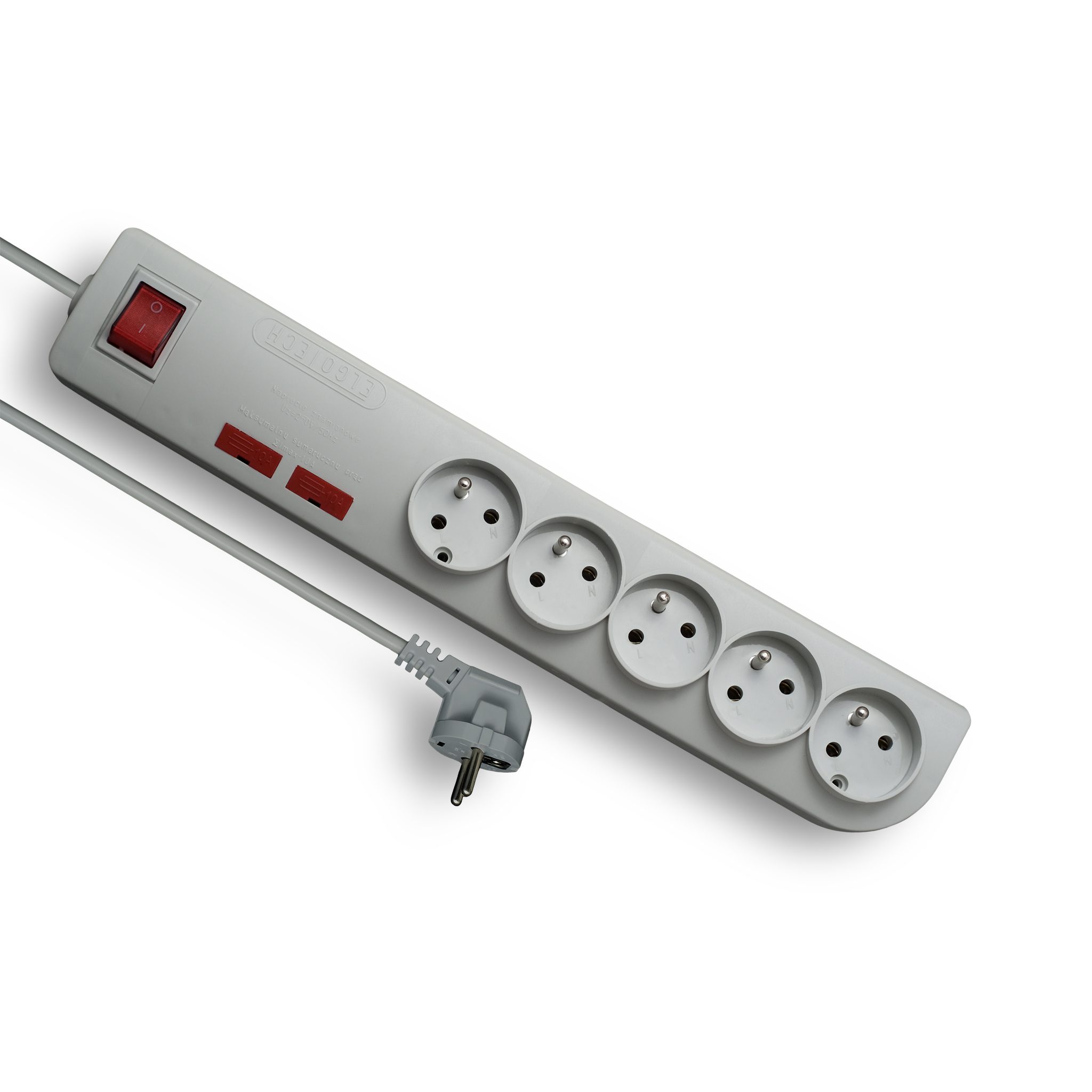 Przedłużacz przeciwprzepięciowy, przeciążeniowo-zwarciowy i przeciwzakłóceniowy 5-krotny z podświetlanym wyłącznikiem dla bezpieczeństwa użytkowania.