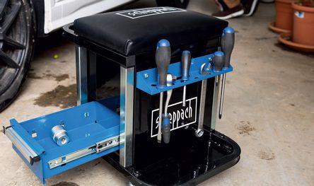 Innowacyjny taboret warsztatowy 2w1, który łączy funkcje stołka na kółkach i wózka warsztatowego, zapewniający komfort pracy i liczne możliwości przechowywania narzędzi.
