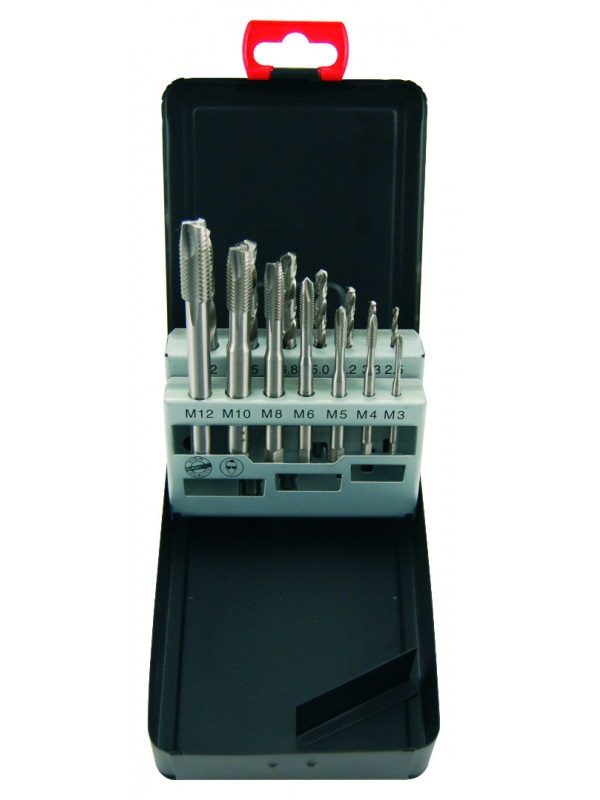 Zestaw profesjonalnych gwintowników maszynowych ABRABORO M3/M4/M5/M6/M8/M10/M12. Wykonane ze stali o wysokiej jakości, DIN 371 / 376. Przeznaczone do stali do 800 N/mm2, w zestawie: wiertła HSS-G DIN 338 2,5/3,3/4,2/5,0/6,8/8,5/10,2 mm.