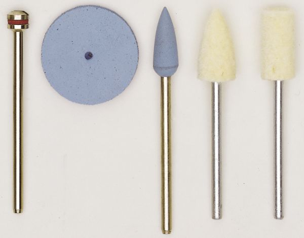 - Zawiera różnorodne końcówki polerskie: cylinder, stożek, koło.