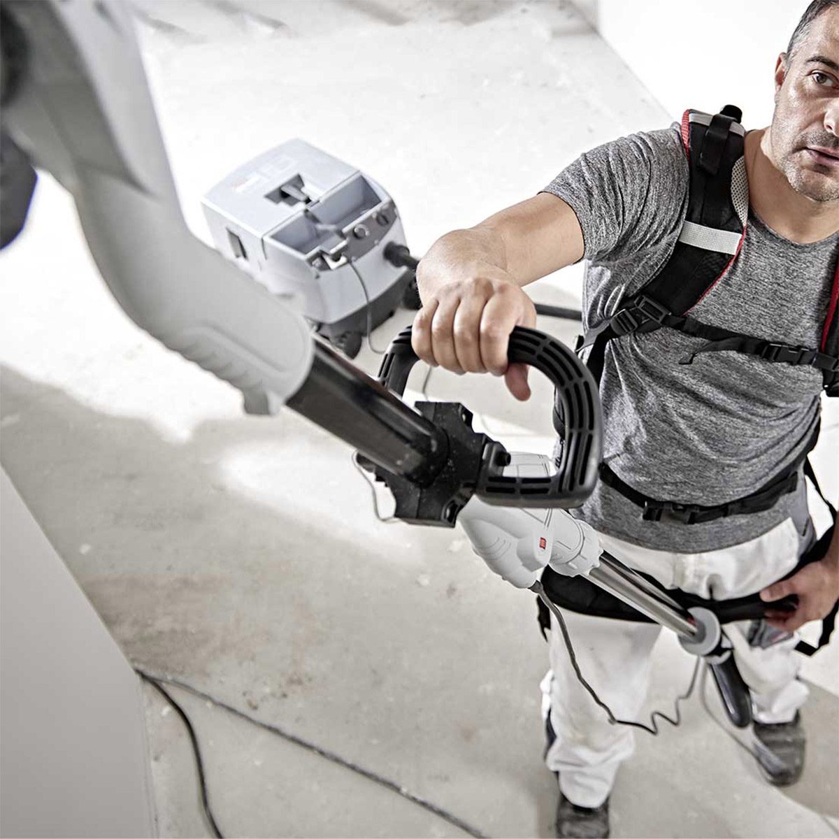 Zestaw przedłużający do szlifierek MENZER umożliwia dokładne szlifowanie powierzchni zaokrąglonych i profilowanych, a także odciążenie kręgosłupa i ramion dzięki wygodnej uprzęży do noszenia.