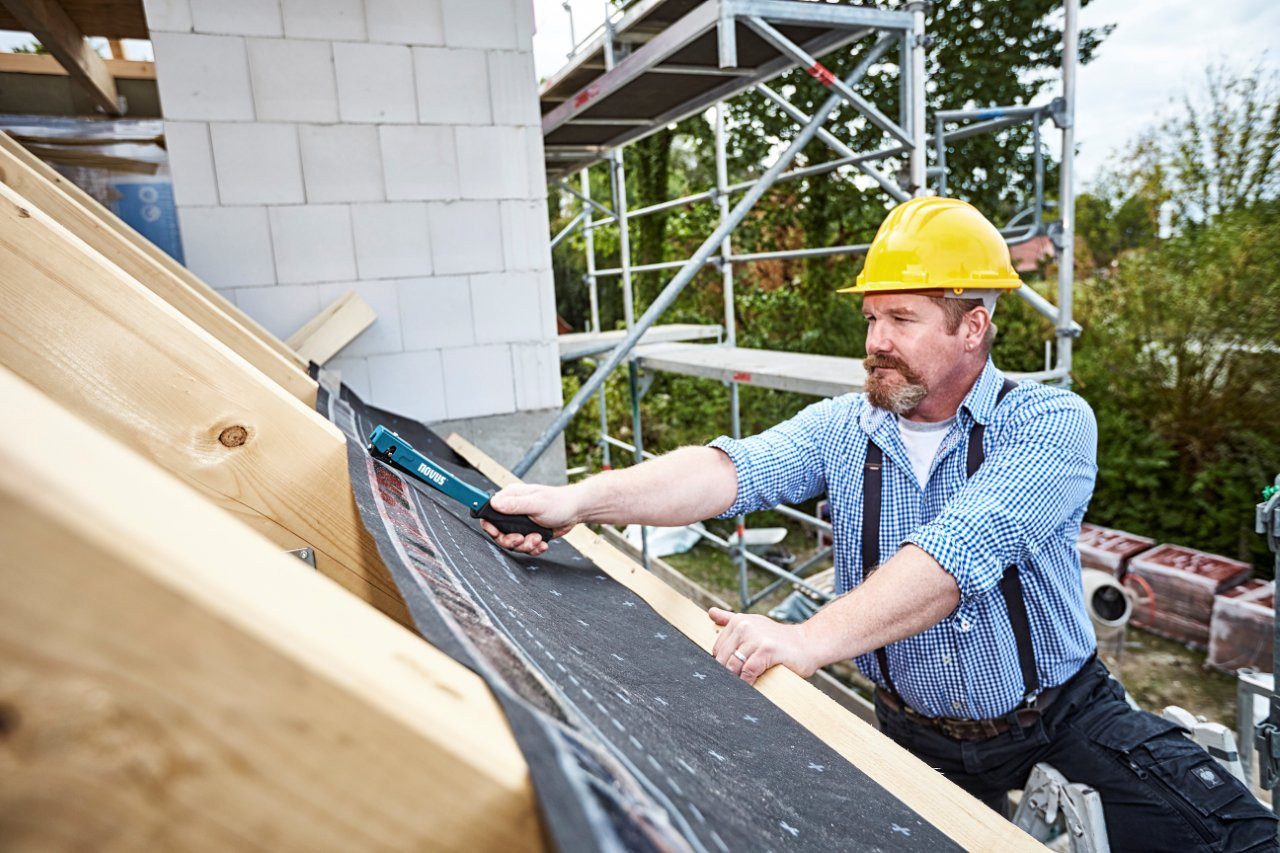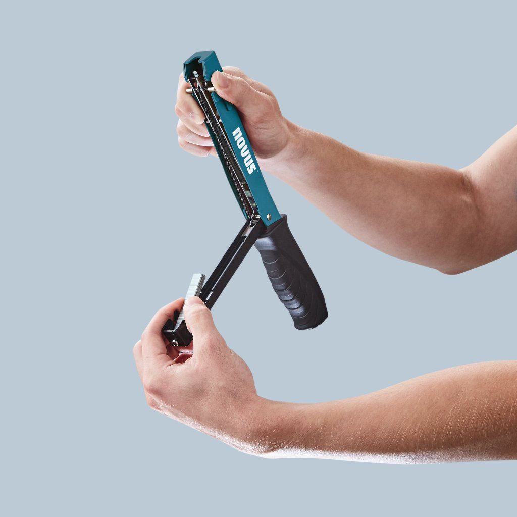 Lekki, solidny zszywacz młotkowy Novus J-022 idealny do szybkiego mocowania dywanów, tkanin, papy dachowej i cienkich podkładów.
